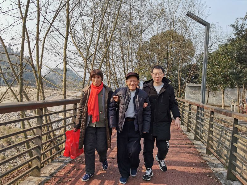 胡老先生在家人和医护支持下载绿道健步行