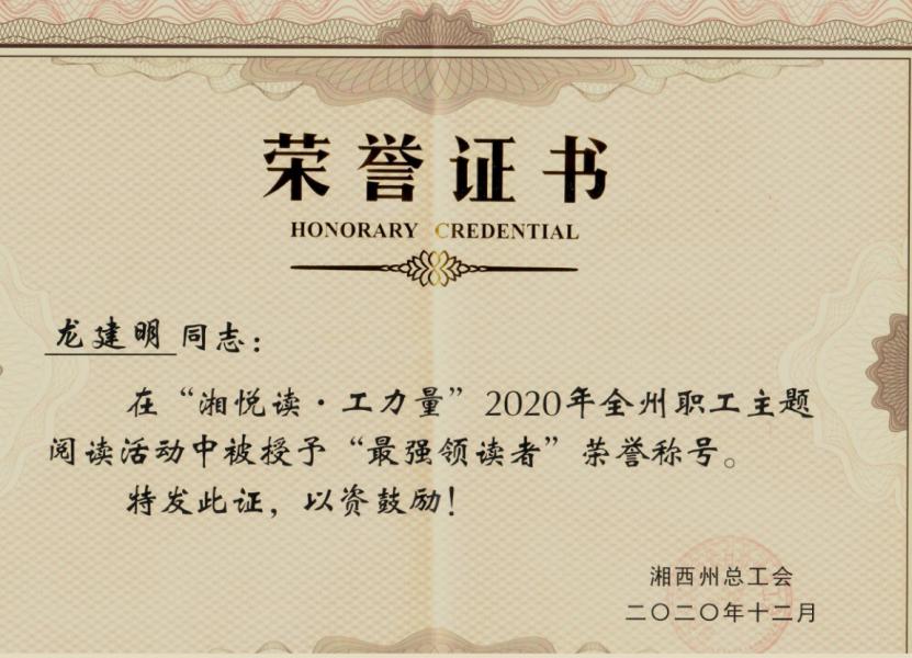 龙建明同志“最强领读者”荣誉证书