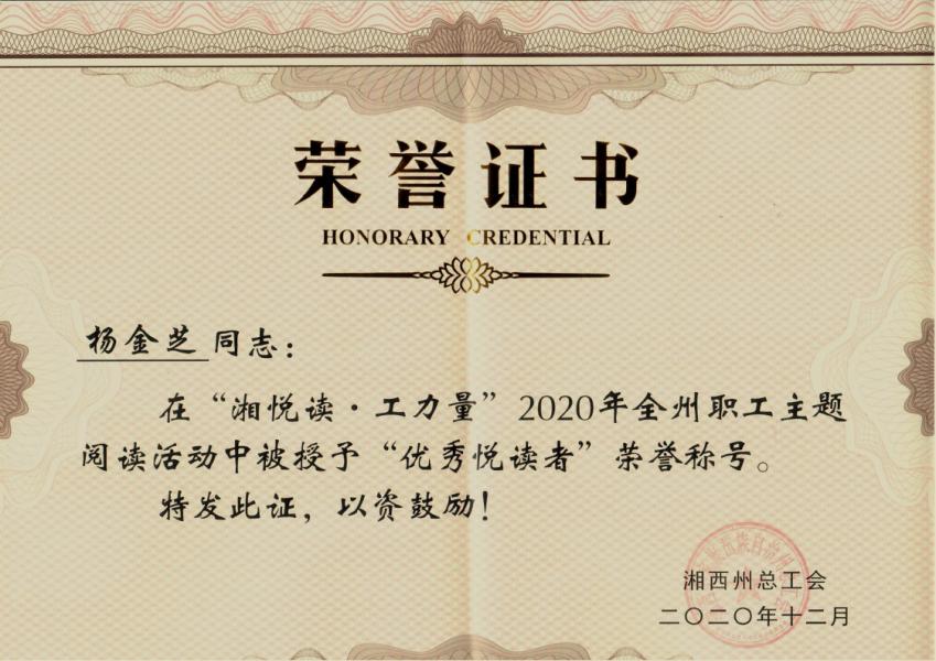 杨金芝同志“优秀悦读者”荣誉证书