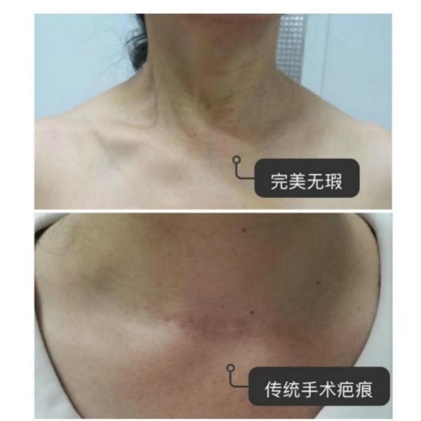 传统手术和腔镜手术对比图 近年来,随着微创技术的发展,越来越多的医生寻求更小的创伤来达到治疗目的。普三科自开科以来,成功完成多例经胸前乳晕入路腔镜甲状腺手术,手术效果好,体表无疤痕,术后所有患者恢复良好,无一例出现声音嘶哑及饮水呛咳,无一例手足抽搐,尤其是无疤痕这一优点,得到众多女性患者的称赞。