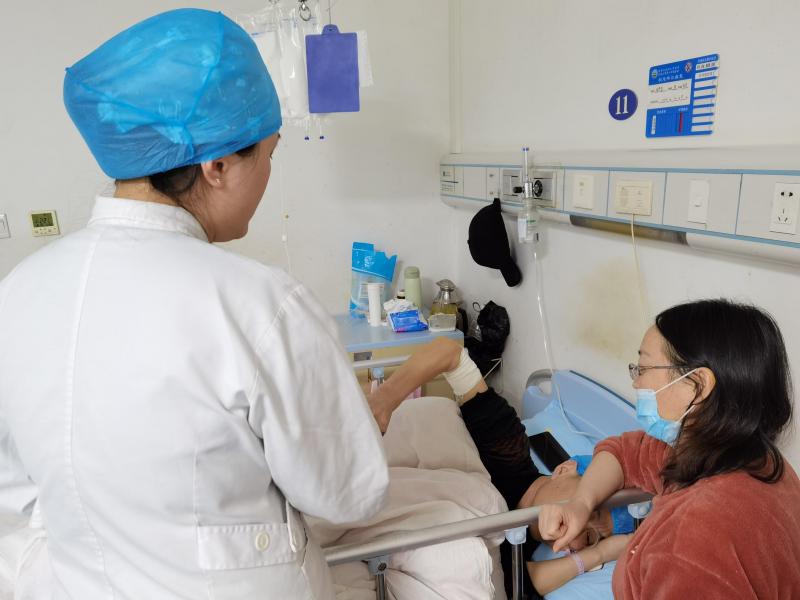护士长张帆及专科护士潘君子为患者选择血管位置。