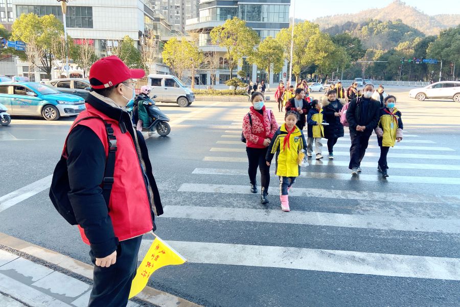 1月18日,第十五党支部志愿者走出院区,在多个交通路口开展文明交通劝导,红色的志愿者马甲点缀了繁忙的街头。