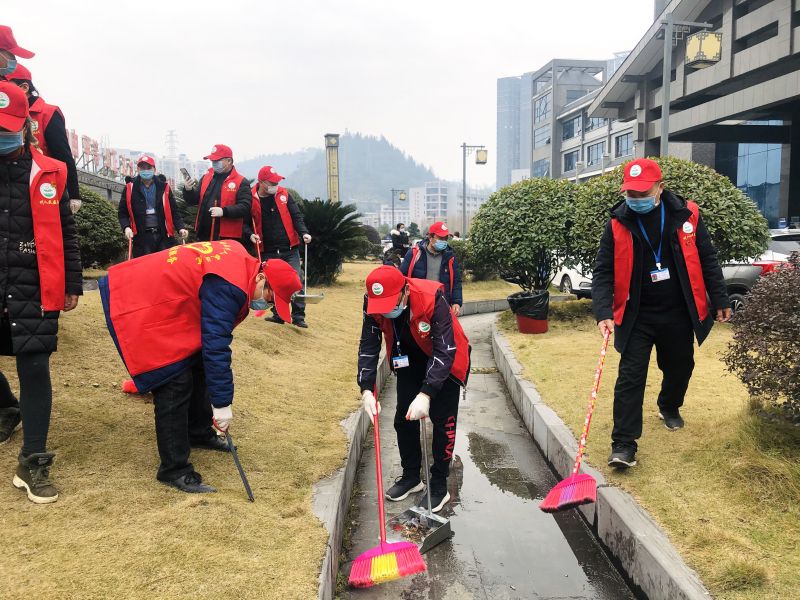 1月22日,第十六党支部志愿者在院内开展爱国卫生行动,洒扫院区,做到文明行动无死角。