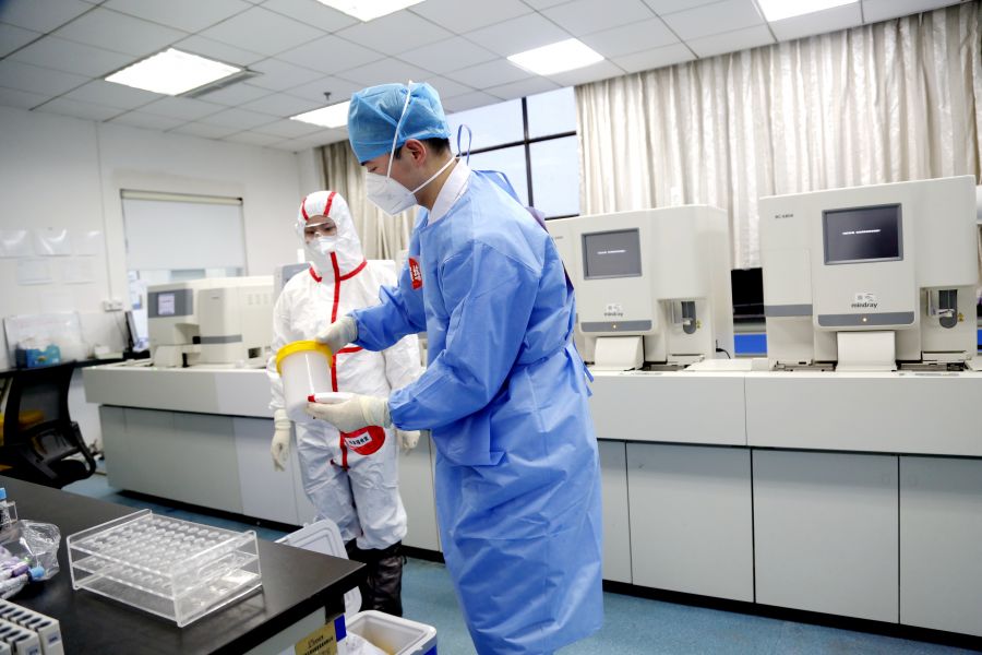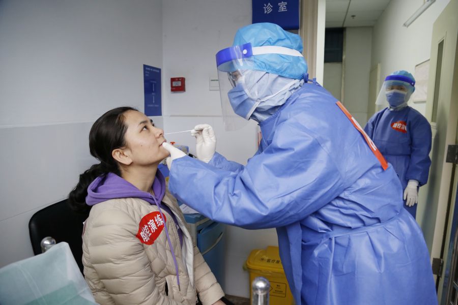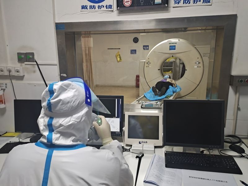 在发热门诊现场,医生严格按照疫情防控流程开展诊疗工作,询问病人流行病学史及症状后开展鼻咽拭子核酸采样和血常规采样,并开具肺部CT检查。发热门诊相关人员电话同步立即通知相关领导和科室,检验科专职人员前来取样、送样,病人前往CT室检查。