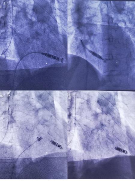 术中,穿刺右股静脉,通过27F血管鞘将Micra无导线起搏器送到右室低位间隔部,释放Micra后确认至少2个钩齿钩住心内膜,测试各种参数满意,手术圆满结束。