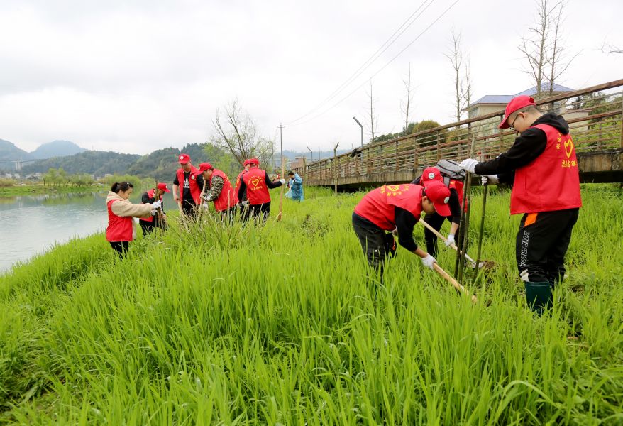 经过紧张劳动,百余株慈竹入住“新居”,与郁郁葱葱的河道、潺潺的流水互为映衬,加上身着红马甲的志愿者们点缀,使得烟雨笼罩中的沿河风光带呈现出一派绿意盎然、生机勃勃的景象。