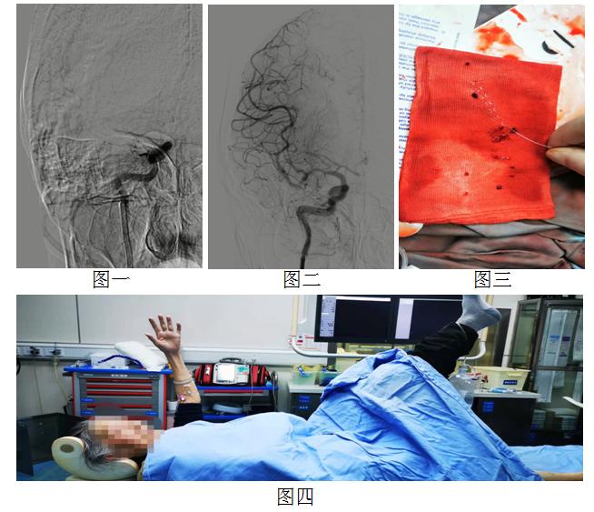 图一:取栓前罗奶奶的脑血管造影检查;图二:取栓后罗奶奶的脑血管造影检查;图三:罗奶奶血管内取出的血栓;图四:取栓后罗奶奶左侧肢体恢复肌力后高兴地抬起手脚;