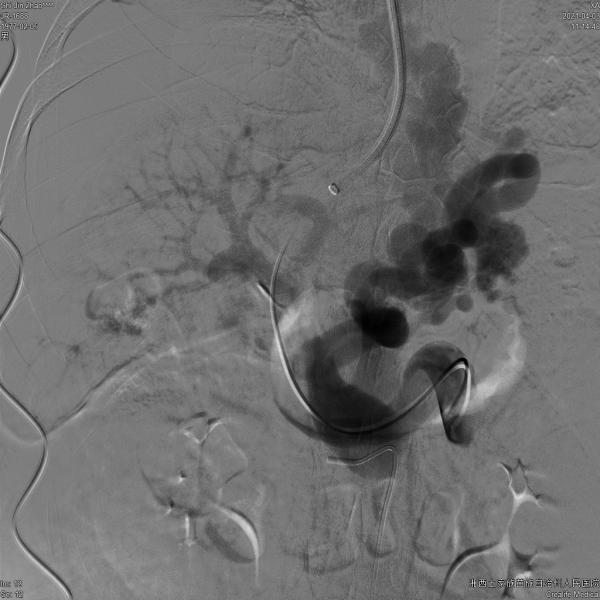 ▲术后造影:粗大的曲张静脉消失,支架内血流通畅