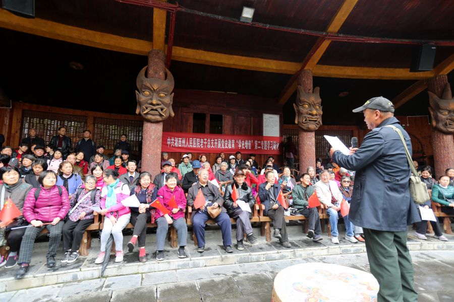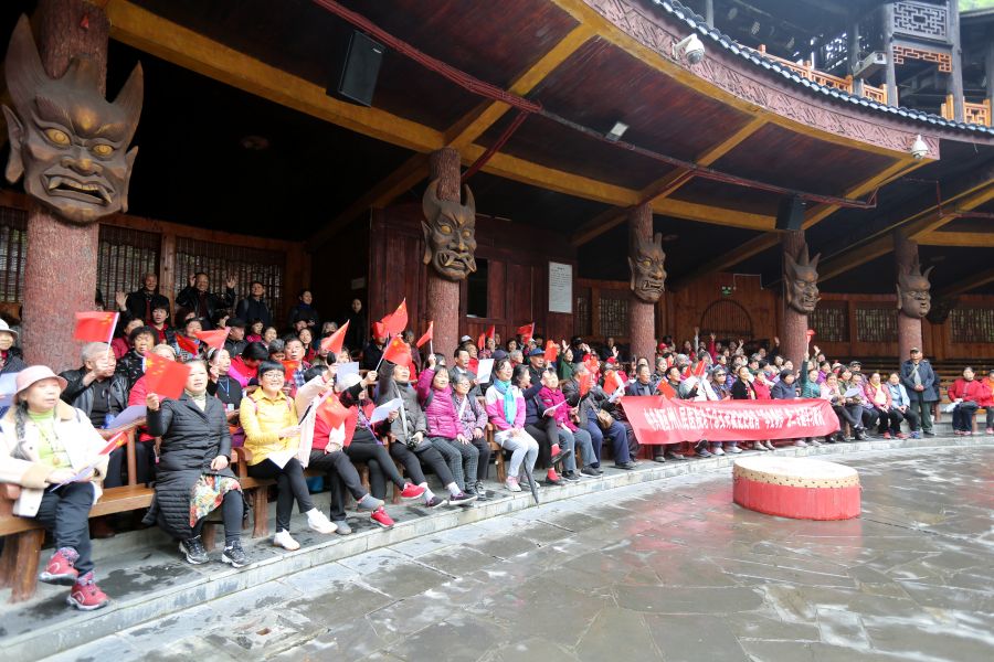 唱支山歌给党听,我把党来比母亲……老同志们与苗族同胞合唱《唱支山歌给党听》,挥舞着手中的小红旗,通过歌曲诉说对党的深情和热爱,铿锵有力的歌声响彻整个峡谷,久久回荡。