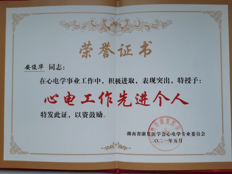 在学术年会开幕式上,学会表彰了一批积极进取、表现突出的心电工作者,我院心功能科副主任医师安俊华获得湖南省康复医学会心电学专业委员会的表彰,授予“心电工作先进个人”。