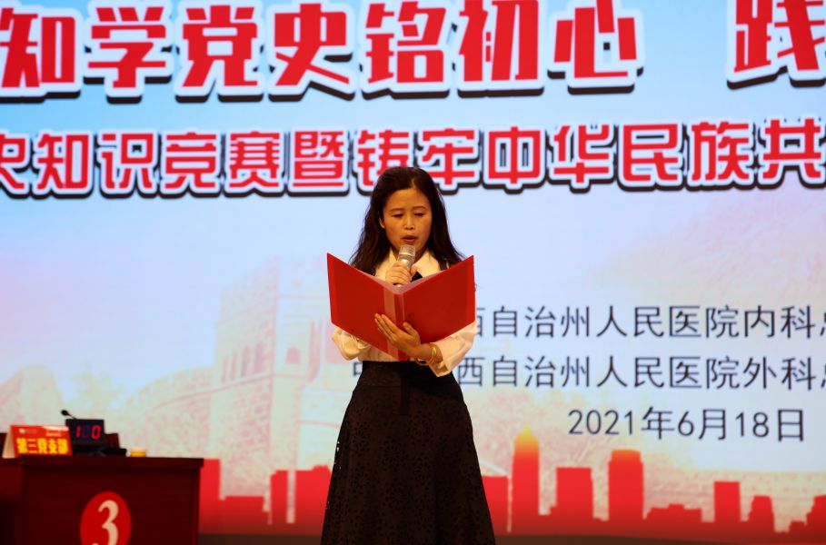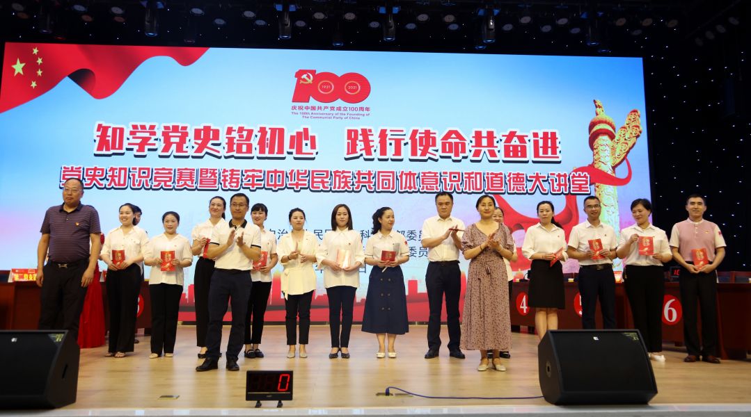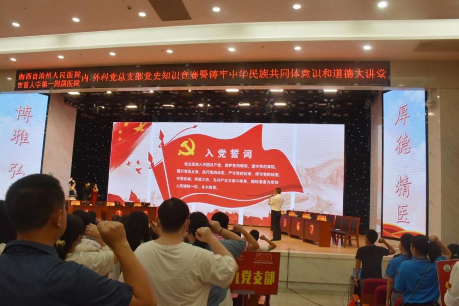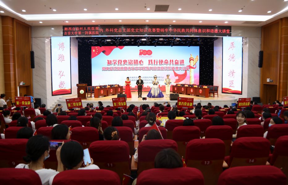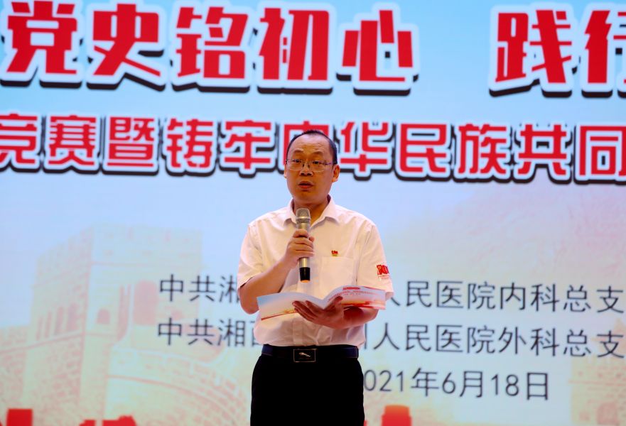 6月18日,湘西州人民医院内、外党总支部联合开展 “知学党史铭初心 践行使命共奋进”党史竞赛暨铸牢中华民族共同体意识和道德大讲堂活动。在家院领导彭剑涛、黄纯海、田茂友、罗勇、江宏冰,以及相关职能科室负责人,内、外党总支部全体党员、入党积极分子、广大干部职工参加。