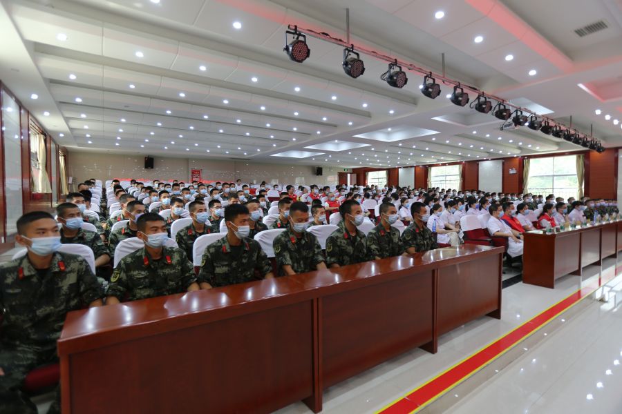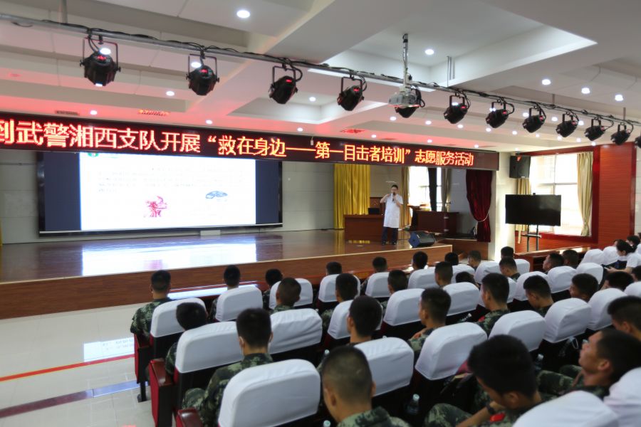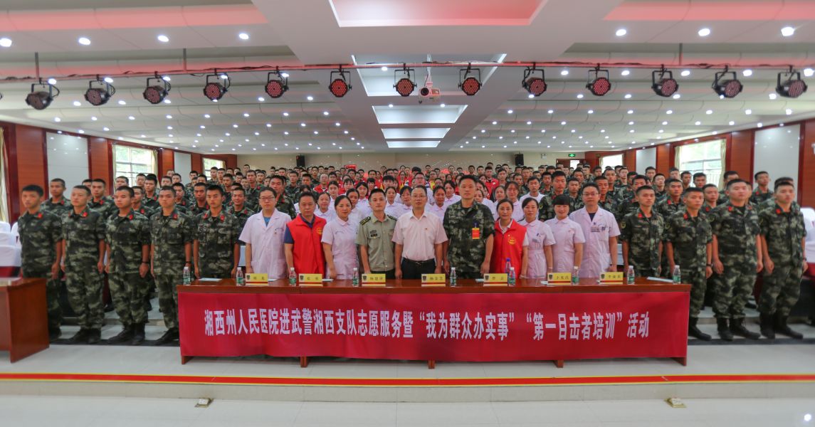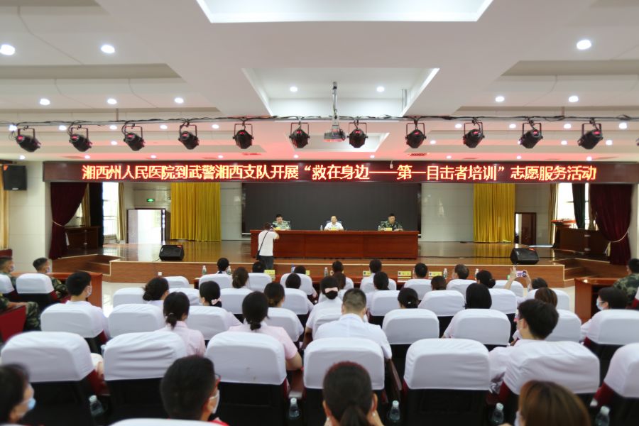 州人民医院院长黄纯海、武警湘西支队副支队长谭佑明出席活动并发言,武警湘西支队官兵200余人及州人民医院行管、内、外科党总支部书记、志愿者团队约80人参加培训。