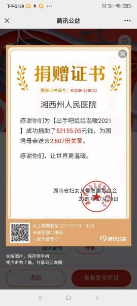 省、州妇联发起“出手吧,姐姐--温暖2021”关爱困境母亲公益募捐活动。我院积极响应,精心组织,广泛发动,全院干部职工踊跃参与,截止2021年7月20日,2493名干部职工积极参与捐款,通过腾讯公益平台成功捐助了52155.05元,名列“湘西战队.湘西黛帕”团队捐赠第一名。获此殊荣得益于大家的爱心奉献,也是干部职工积极响应党中央号召,为群众办实事的具体表现。