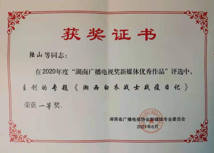 近日,2020年度“湖南省广播电视新媒体优秀作品”评选结果揭晓,由宣传科策划主创、抗疫英雄李康花配音的《湘西白衣战士战疫日记》获新媒体类一等奖。