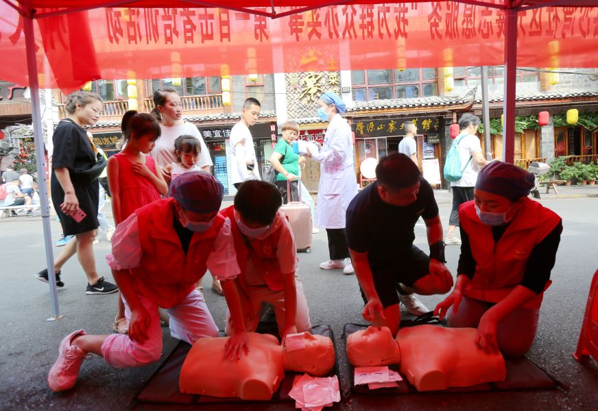 同时,志愿服务者现场开设课堂,为沙湾社区工作人员、居民、游客进行心肺复苏、气道异物梗阻等急救院前急救“理论+实操”第一目击者培训。