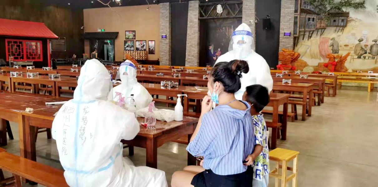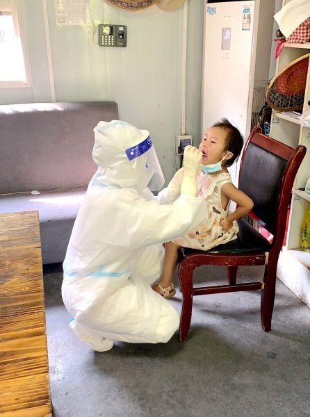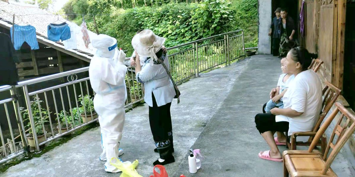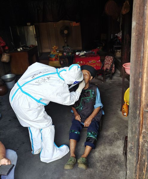 8月1日中午,气温高达38℃,体感温度超40℃,我院医务人员依旧穿着厚重的防护服,走村串户上门为老弱病残进行核酸检测。