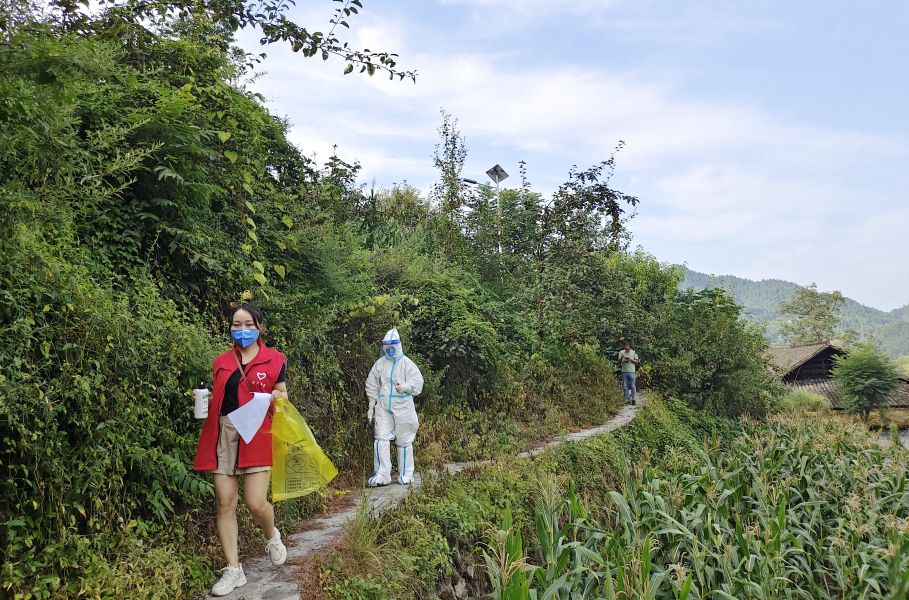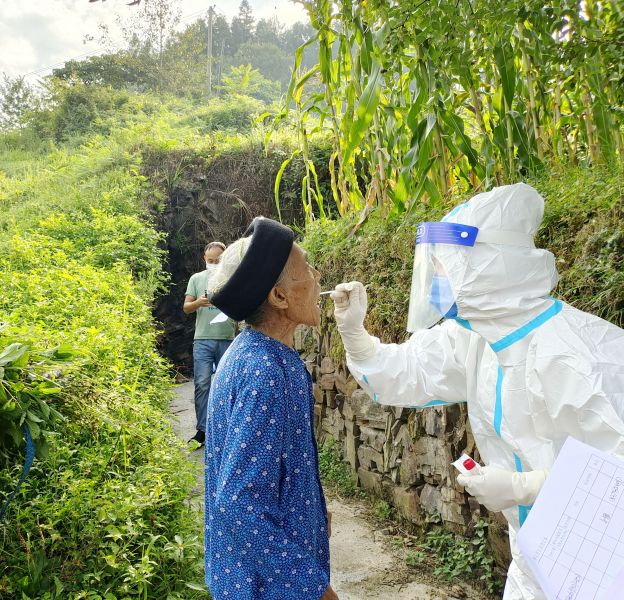 烈日下,身着厚厚的防护服,爬山、踏田坎,为老人上门核酸采集。