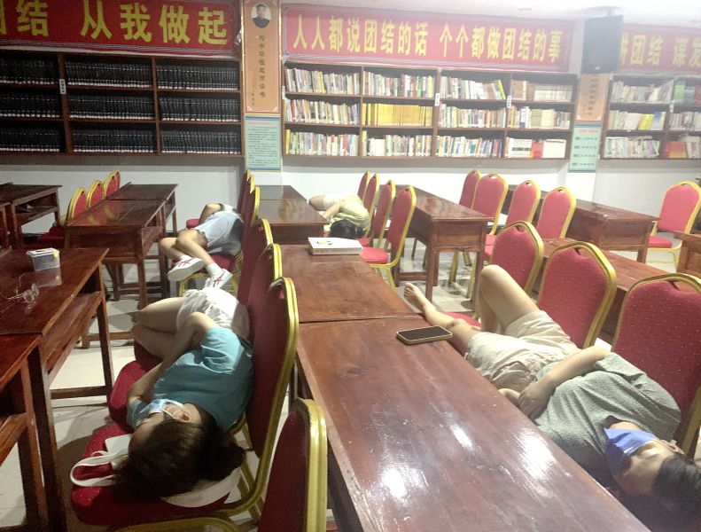 脱下“重甲”战袍的战士,利用空闲时间,以桌椅为床,进行短暂休整。