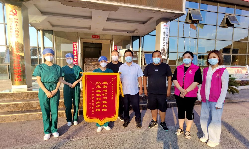 8月5日晚6点,中铁十八局集团有限公司张吉怀铁路项目部负责人将一面写着“最美逆行不惧风险 众志成城共抗疫情”的锦旗送到湘西州人民医院支援古丈墨戎核酸采样队队长王建梅手上,感谢她们上门为项目部全体人员进行核酸检测采集,筑牢疫情防线所做的贡献。