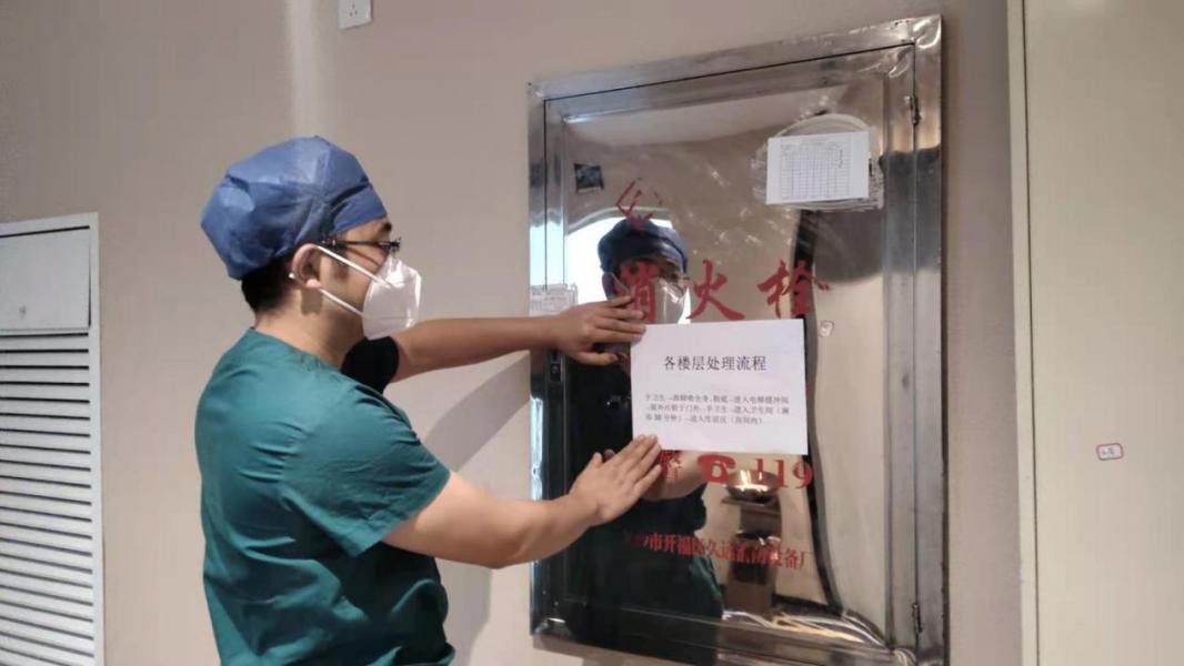 为了确保工作有序开展,保障队员的安全,“大总管”王焕栋根据领队杨建萍和院感督导员曹鹰的工作要求,在酒店各楼层粘贴工作流程示意图标识。