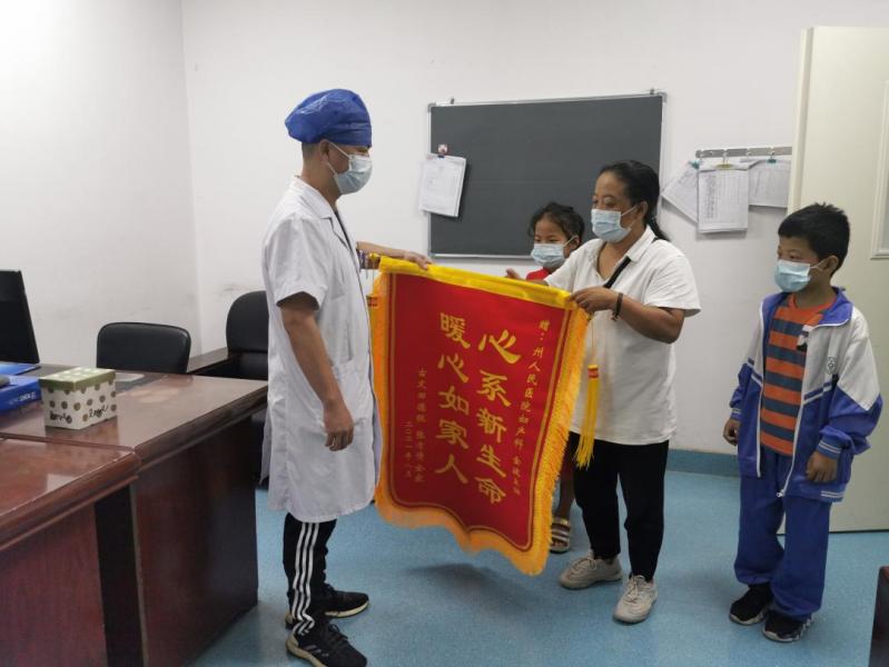 8月26日,张女士带着一双儿女捧着一面精心制作的锦旗,来到州人民医院,亲手送到了金波手中。看着当时救治的新生儿如今茁壮成长,金波更坚定了冲锋在医疗救治一线的理想信念。