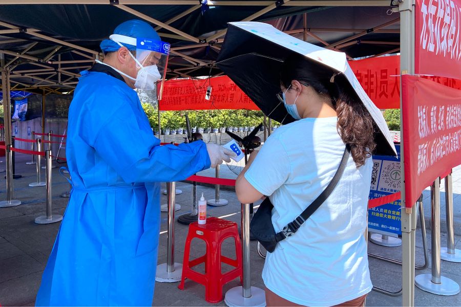 特勤队员身着全套医用防护用具在核酸检测点执勤