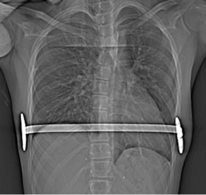 术后的胸片显示置入的钢板位置良好,胸廓矫形满意