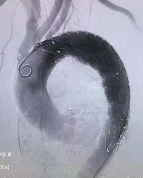 术中丁文金主刀,带领介入血管科团队顺利为患者行主动脉夹层覆膜支架腔内修复术,术后造影复查显示破口已完全封闭,患者胸背部疼痛情况消失,术后复查CTA提示破口封堵良好,目前患者已出院休养。