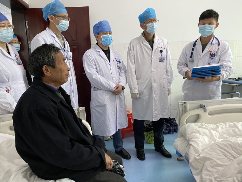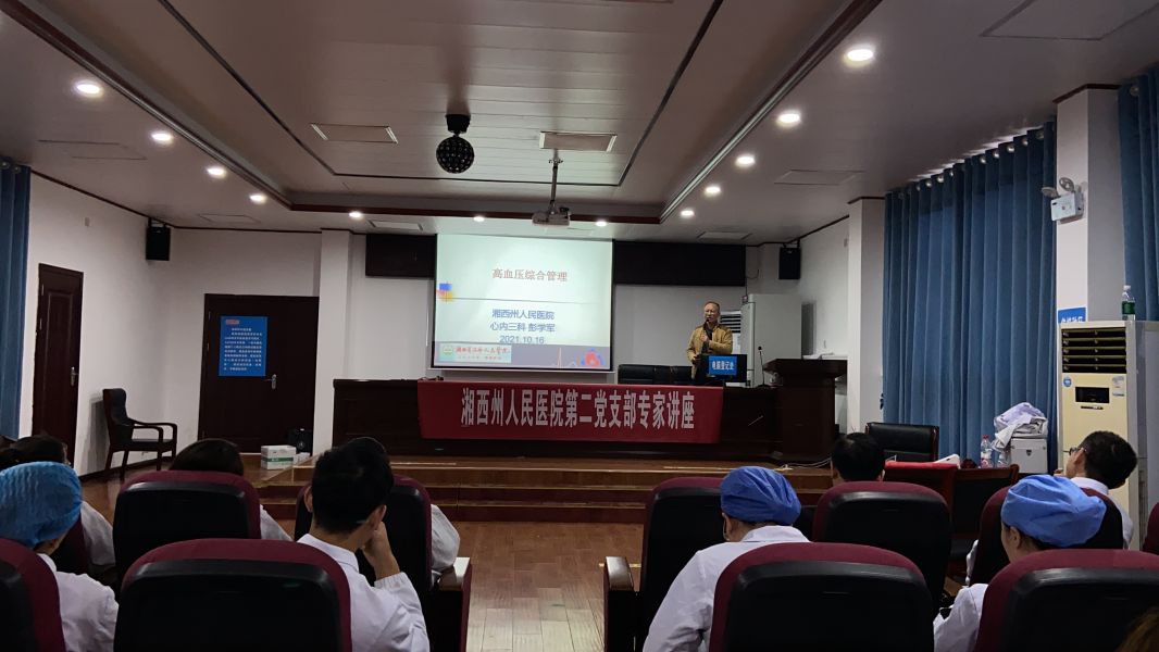 在花垣县麻栗场镇中心卫生院,支部书记彭学军带领查房组深入病房查房,随即开展高血压、卒中专题知识讲座。