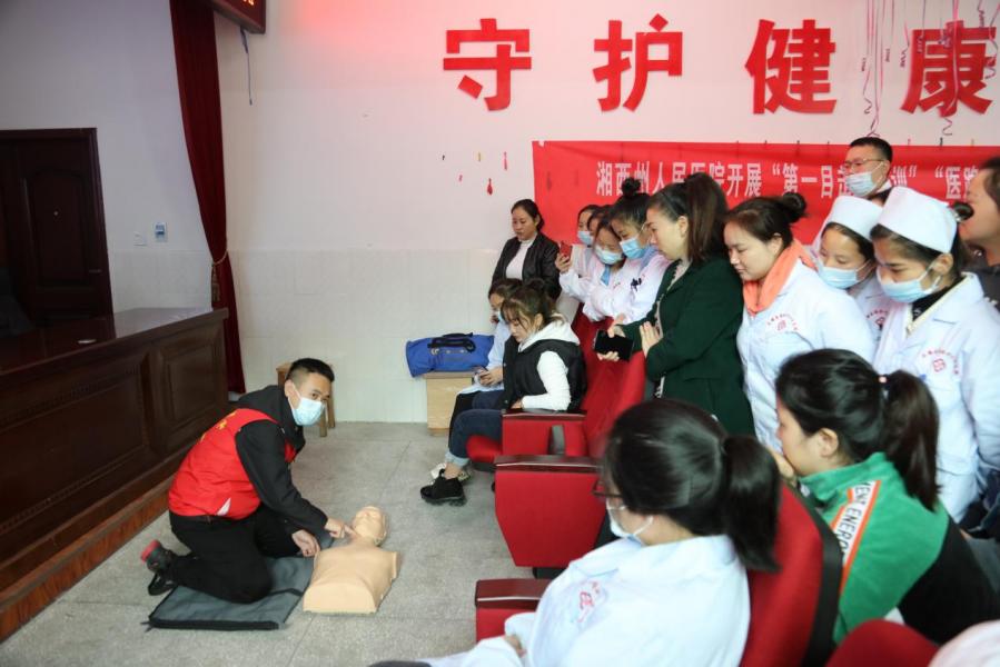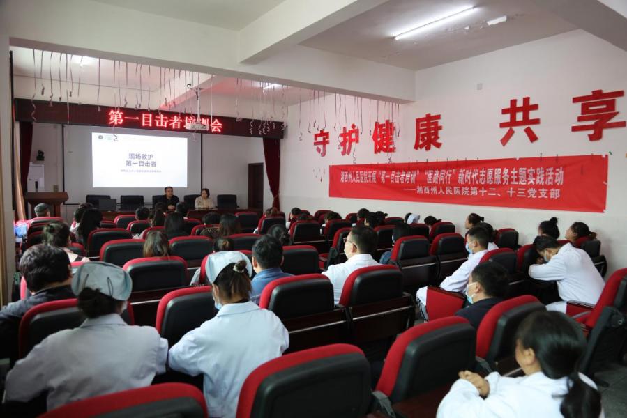 同时,部分党员代表与永顺县塔卧镇中心卫生院举行对接座谈会,就下一步医疗帮扶工作持续有效推进,扎实解决群众遇到的医疗相关难题进行了探讨。会议期间,州人民医院青年志愿者还开展了“现场救护—-第一目击者行动”知识培训,为塔卧镇中心卫生院的医护人员传授最新版的院前急救知识与方法。