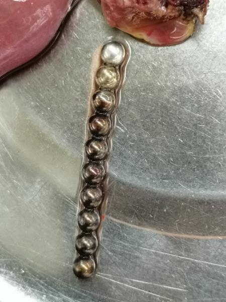 追问病史,发病6天前,患儿爷爷曾带孩子到亲戚家玩耍,亲戚家10岁小孩有磁力珠这种玩具,考虑到消化道异物已经存留多日,且导致胃肠穿孔,需急诊手术。经普五科急会诊及术前准备,于入院当日晚在急诊全麻下行剖腹探查术,术中见“胃两处穿孔”、“近段小肠三处穿孔”、“部分小肠因肠梗阻缺血坏死”。遂行胃肠穿孔修补、坏死部分小肠切除及断端一期吻合,同时从胃肠道及腹腔内取出磁力珠十枚。术后经过抗炎、营养支持,伤口换药等处理,患儿痊愈出院。