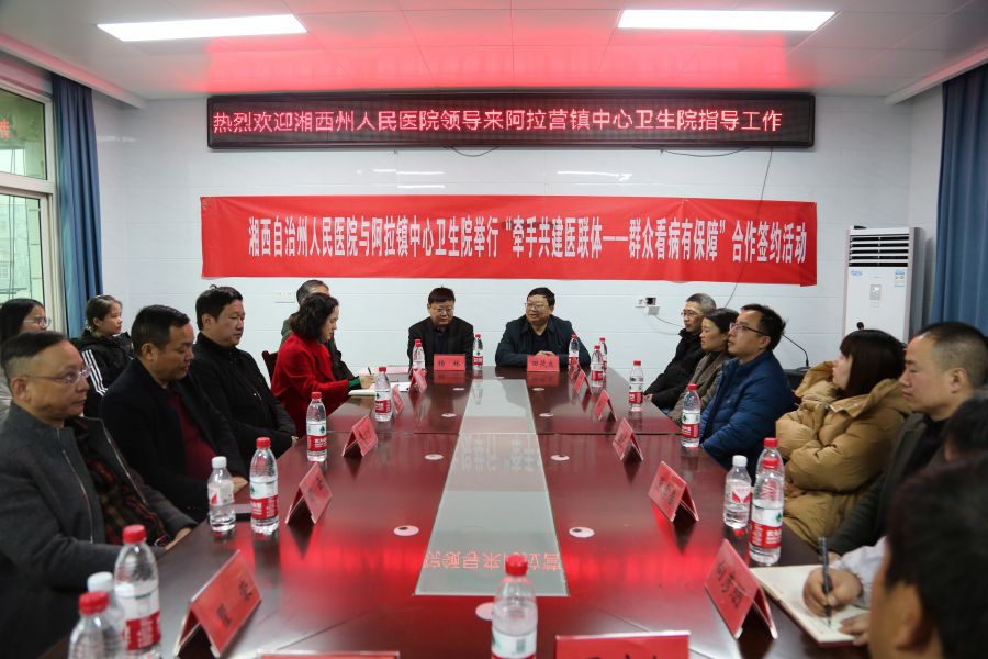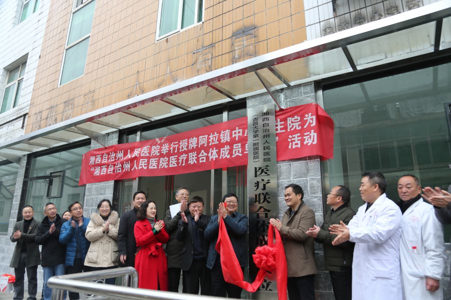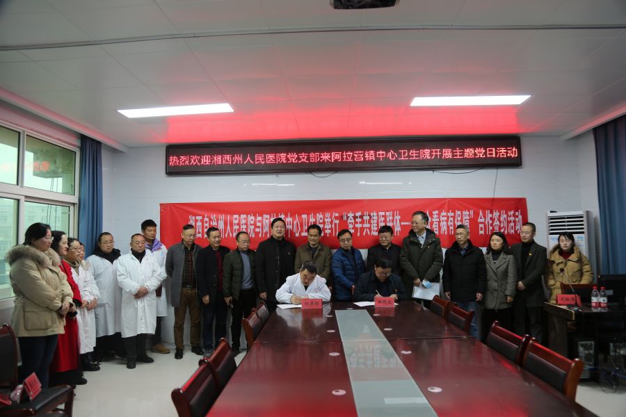 现场,我院与阿拉营镇中心卫生院正式签约“医联体”联盟,挂牌成立“湘西自治州人民医院(吉首大学第一附属医院)医疗联合体成员单位”,帮助指导学科提质,凸显学科特色,提高医疗服务能力和水平。党支部联系院领导田茂友与凤凰县卫健局、阿拉营镇中心卫生院相关负责人共同揭牌或签署合作协议。