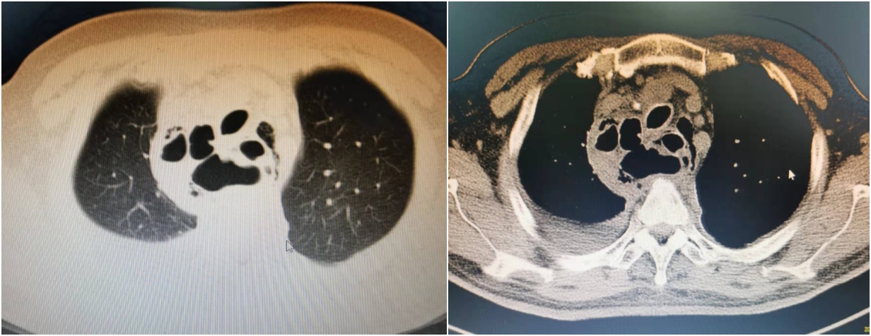 术前CT显示纵膈内大血管、气管、食管间隙广泛气肿并存液气平面