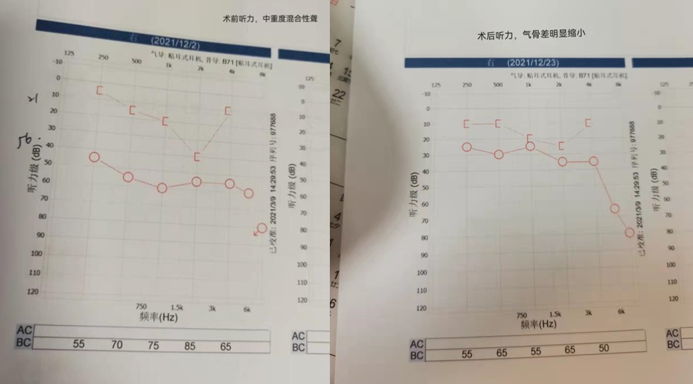 经与刘某及家属充分沟通后,12月3日,耳鼻咽喉头颈外科手术团队在全麻下开展手术,术后患者恢复良好。术后12天康复出院,术后近一个月门诊复查,听力明显提高,听小骨位置在位,鼓膜愈合好。