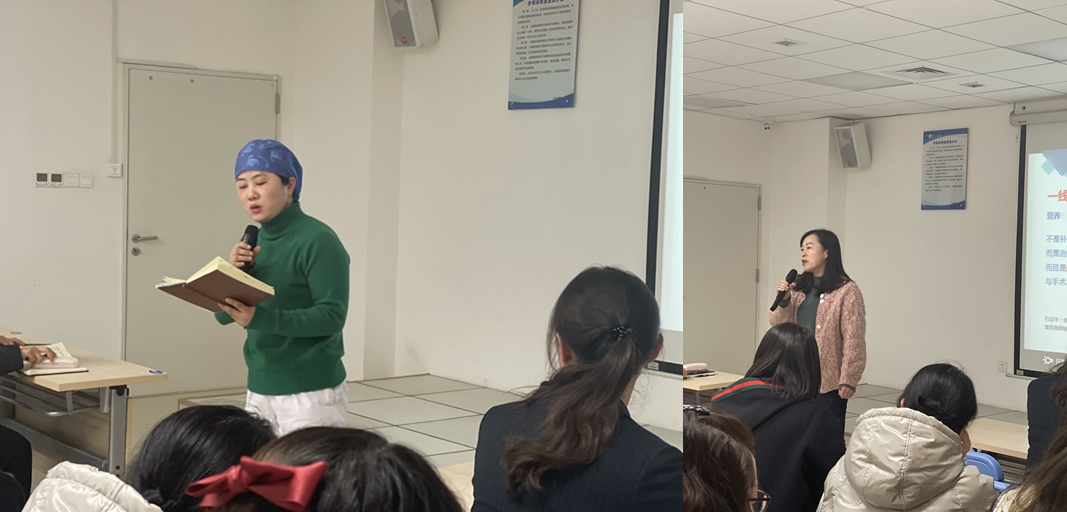 授课现场,普一科护理人员以新颖的“问答”形式,从“为什么要用肠内营养”、“肠内营养的现状”、“怎样开展肠内营养”、“肠内营养的护理原则和未来发展方向”四个方面阐述了肠内营养护理,强调了肠内营养的重要性,并就肠内营养的方法、技巧以及难点和要点作精彩讲解,让大家面了解肠内营养护理规范化管理。