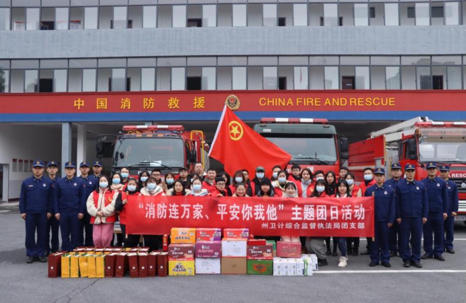 州卫健委团委为消防中队赠送基础生活物资,所有参加人员与消防人员合影