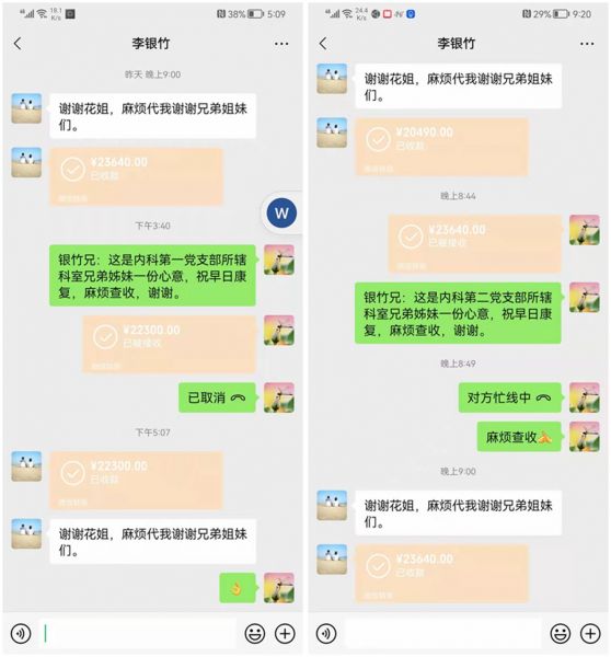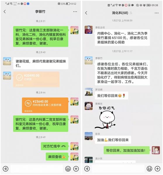 倡议书一经发出,得到了党员、干部职工的积极响应。大家纷纷参与,通过线上线下等捐款方式,伸出友爱援助之手,奉献出自己的一份爱心,帮助挺过难关。1月27日上午,消化内一科主任李凯及同事作为代表到湘雅附一医院看望李银竹,并将消化内科爱心捐款共计65100元全额转交给本人。同时详细询问了他的身体健康状况、生活情况和家庭状况,鼓励他要保持乐观健康心态,鼓足信心,积极配合治疗。截至目前,共筹集爱心捐款131530元。