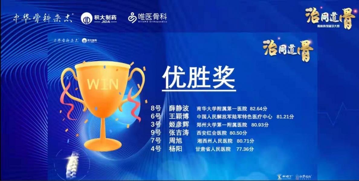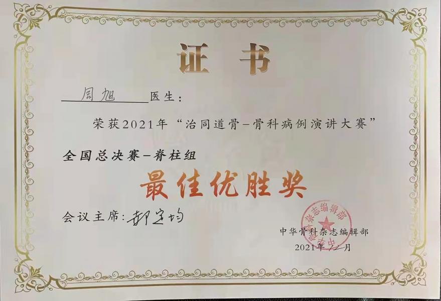 近日,由中华骨科杂志主办的“治同道骨——骨科病例演讲大赛全国脊柱总决赛”线上比赛圆满落幕,湘西州人民医院脊柱外科主治医师周旭作为湘鄂区域代表参赛,并以总分排名第七的成绩斩获脊柱组最佳优胜奖。