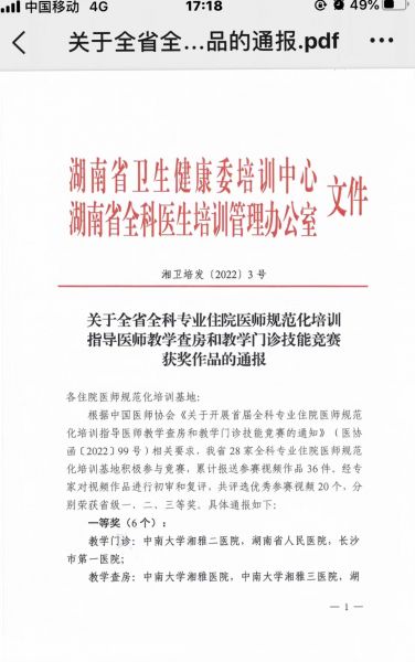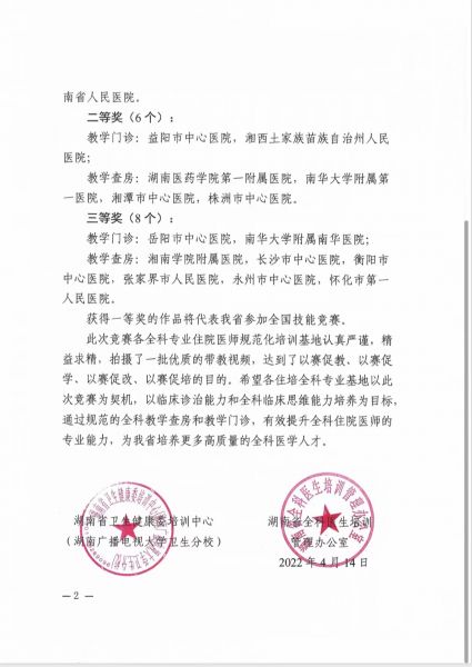 2022年4月14日下午收到湖南省卫健委培训中心通报,我院全科专业基地参加湖南省首届全科专业住院医师规范化培训指导老师教学查房及教学门诊技能竞赛,获教学门诊技能竞赛二等奖。