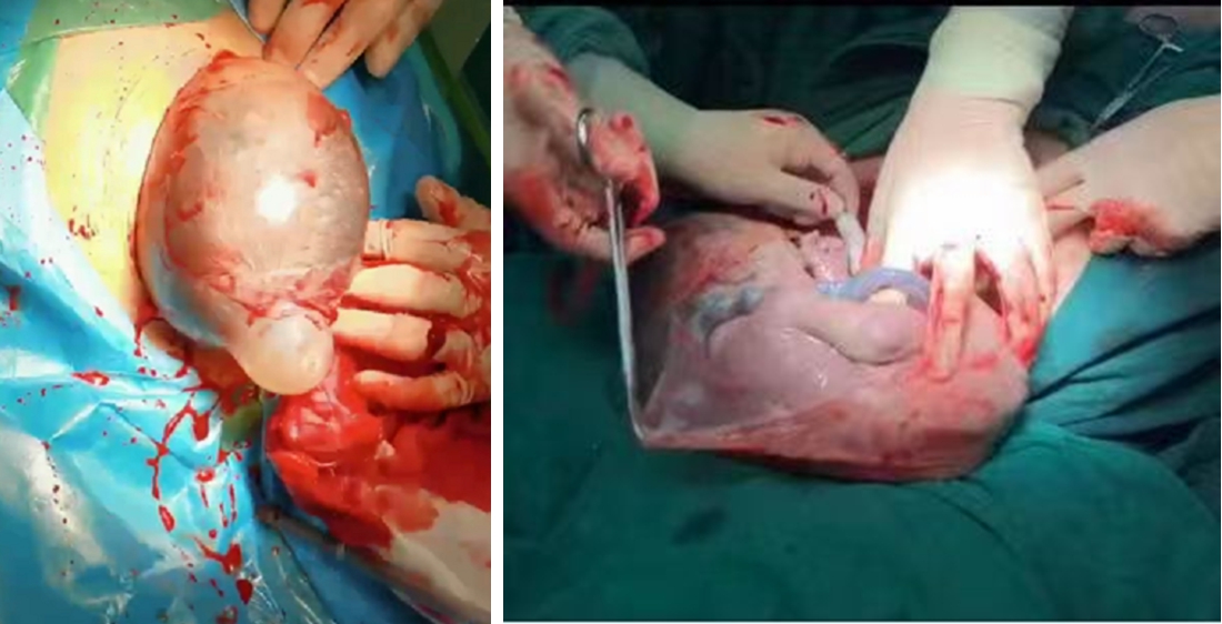 产妇胎膜自然破口,术中清晰可见 ;体外打开羊膜囊       自2019年,产科已开始开展保留胎膜分娩的剖宫产术式,该术式多应用于早产且未发生胎膜早破的孕产妇。因这一新术式要求术者巧妙温柔地将羊膜囊完整托出子宫外,整个过程需要一定的手术技巧,经过多年的经验积累,将该术式成功应用于早产胎膜早破的产妇尚属首次。此次早产胎膜早破的剖宫产新术式的成功开展,标志着我院孕产妇及早产儿的救治能力迈上新台阶。