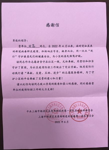一封感谢信 书写同心守沪“战疫”情