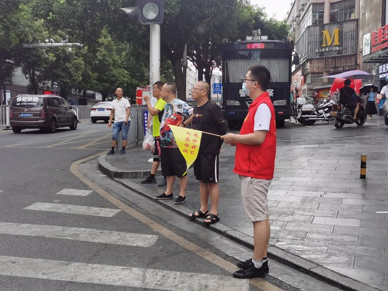 志愿者在吉首步步高商场周围人行道进行交通劝导