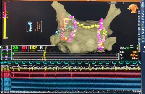 该患者患有高血压、糖尿病、心房颤动,平时频繁出现心慌、气短等不适,药物治疗效果不佳,根据血栓栓塞风险评估属于高危人群,有抗凝指征,但是口服抗凝药后出现血尿,如果不尽早干预,发生脑卒中、心力衰竭、器官出血等并发症风险大。该患者入住心内三科后,科主任彭学军主任医师带领团队认真分析病情,积极完善食道超声、左心房CTA等术前检查,综合评估患者卒中风险及长期口服抗凝药物出血风险,经与患者、家属商讨,决定同意采用房颤射频消融联合左心耳封堵“一站式”手术解决患者的房颤及预防脑卒中问题。