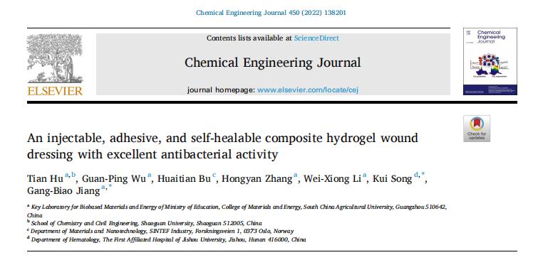 近日,我院大内科主任、肿瘤中心主任、血液科主任宋奎博士以吉首大学第一附属医院为署名单位,作为通讯作者和华南农业大学蒋刚彪教授团队的研究成果以“An injectable, adhesive, and self-healable composite hydrogel wound dressing with excellent antibacterial activity”为题发表在《Chemical Engineering Journal》(JCR 1区期刊,影响因子16.744)杂志上。