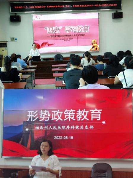 外科党总支部副书记杨建萍带领大家学习了“四史”,十一党支部副书记陈冬英就时下形势政策和大家进行了交流,引导党员干部不断检视初心、滋养初心,巩固和升华理想信念,不断锤炼忠诚干净担当政治品格,不断提升服务本领,为人民群众健康保驾护航,以优异成绩迎接七十周年院庆,以昂扬姿态迎接党的二十大胜利召开!