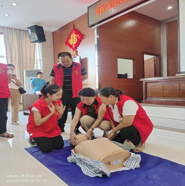 “在实施心肺复苏时,首先要判断被施救者的意识,看看被施救者是否有呼吸、脉搏……”医护人员一边讲解一边演示心肺复苏的具体操作细节及方法,州农业农村局干部职工也在医护人员的指导下学习心肺复苏的操作步骤。