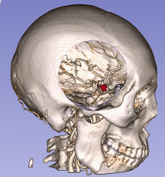 手术入路推演,红色标记为动脉瘤 患者为51岁男性,因“突发剧烈头痛7小时”入住湘西州人民医院神经外二科,通过详细体格检查和该院最新双源CTA检查,诊断为:1.蛛网膜下腔出血;2.右侧大脑中动脉M1段分叉部动脉瘤,患者颅内动脉瘤随时有再破裂的可能,如不及时手术,将危及生命。