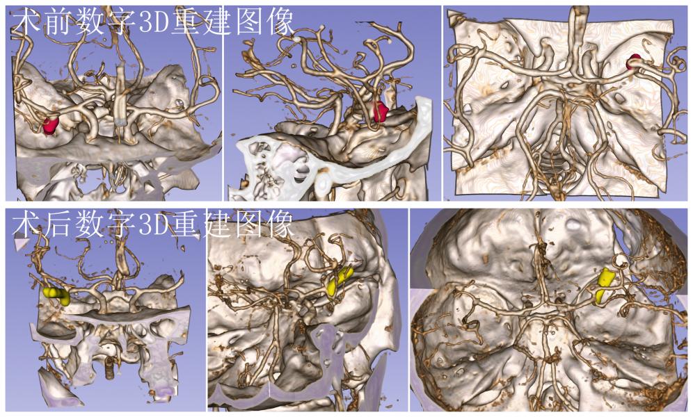 术前和术后数字3D成像,可见动脉瘤已确切夹闭,颅内正常血管通畅,术前图像红色标记为动脉瘤,术后图像黄色标记为动脉瘤夹。