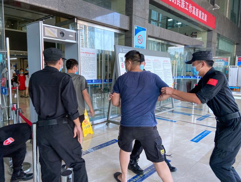 演练模拟呈现的情景是“嫌疑人”拒不配合医院疫情防控规定,与保安人员相互撕扯引发纠纷,继而升级到携带管制刀具强行闯入医院进行暴力打、砸。院武装部接到报告后,迅速拉响警报,多组特勤队配合快速到达事发现场。一边有序引导疏散医护人员和就诊患者,维护现场秩序,录像取证,一边组织特勤队员利用防暴盾牌、钢叉、警棍,牵制和阻止“嫌疑人”实施犯罪活动,并伺机将“嫌疑人”制服。院警务室人员接警后赶到现场将“嫌疑人”带离,恢复正常医疗秩序。