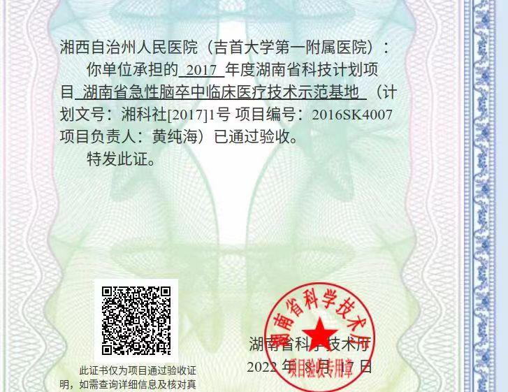 近期,湘西州人民医院院长黄纯海主持的“湖南省急性脑卒中临床医疗技术示范基地”项目正式通过验收。